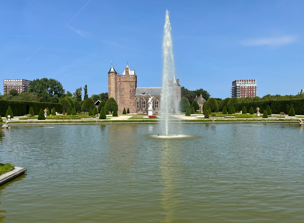Ruim 300 jaar geleden kocht de rijke Amsterdamse Koopman Jean Deutz het kasteel en liet een prachtige symmetrische baroktuin met vijver aanleggen. In de tuin liggen 2 prachtige kopergravures die laten zien hoe het er vroeger uit zag. Thijs nam ons eerst mee naar het rosarium met wel 150 soorten rozen. Er staan ook 150 soorten Appel- peer- en kersenbomen. De buxus boompjes hadden te lijden gehad van de buxusmot en waren vervangen door de Ilex boompjes.